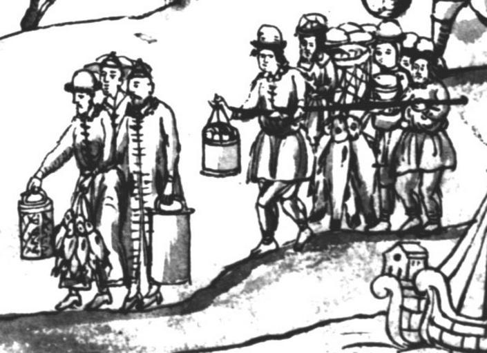 | Keywords: IstSib074 3.jpg  Тата ы и осяки п иносят казакам  ыбу и овощи Исто ия Сиби ская  ультимедиа Цент  ГУ http //www mmedia nsu ru/vbook/vbook/obj8/MINIATURES htm 1697 - 1703 С У Ремезов Author died more than 70 years ago - public domain PD-old Remezov Chronicle |