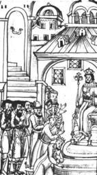 | Keywords: IstSib103 1.jpg  Посольство с пленными Сейдяком Салтаном и Ка ачей в  оскве у госуда я Исто ия Сиби ская  ультимедиа Цент  ГУ http //www mmedia nsu ru/vbook/vbook/obj8/MINIATURES htm 1697 - 1703 С У Ремезов Author died more than 70 years ago - public domain PD-old Remezov Chronicle |