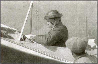 Keywords: IT59.jpg Jorge Chávez con su casco de vuelo en la cabina de su avión Bleriot listo para partir del campo de Briga para el cruce de los Alpes PD-old History of Peru Jorge Chávez Dartnell