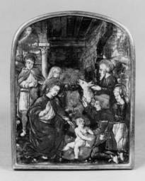 | Keywords: Italian - The Adoration of the Shepherds - Walters 44122.jpg The Christ child nude and seated on a bundle of straw in a contrapposto pose receives the homage of a shepherd and his wife who kneel at the right St Joseph stands behind them while the Virgin kneeling in the left foreground extends her left hand towards the child and uplifts her right hand as if to answer the shepherd's gesture of salutation Behind her an old woman advances followed by a youth holding a lantern In the background the ass pulls fodder from the hay-rick and the ox lies on the ground The scene takes place in a ruined and open rectangular hall with courses of stones and ceiling-beams of wood set in perspective On the left of the ruins a column supports the spring of an arch Two landscape vistas open at left and right 2nd half Other date century 15 painted translucent and opaque enamels on silver cm 6 7 5 accession number 44 122 22892 Markus Antokolsky Paris date of acquisition unknown by purchase Markus Antokolsky Sale Hotel Drouot Paris June 10 1901 no 58 A von Lanna Prague date of acquisition unknown by purchase A von Lanna Sale Berlin November 9 1909 no 47 George Robinson Harding London date of acquisition unknown by purchase Henry Walters city Baltimore Walters Art Museum Henry Walters Acquired by Henry Walters 1912 place of origin Florence Italy Walters Art Museum license 2D Italian Renaissance paintings in the Walters Art Museum Italian art in the Walters Art Museum Media contributed by the Walters Art Museum needs category review |