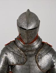 | Keywords: Italian - Armor for the Duke of Medina Sidonia - Walters 51585 - Detail.jpg This armor is engraved all over with a design based on an M signifying the duchy of Medina Sidonia It was made for Don Alonso Perez de Guzman el Bueno duke of Medina Sidonia 1550-1615 Extremely rich he was also commander of the Spanish fleet the Armada under King Philip II father of the Archduchess Isabella Spanish governor of the Southern Netherlands The background is darkened to contrast with the raised partially gilded decoration This armor was for use on horseback on the battlefield or for tournament jousting; on the right side of the breastplate are holes for bolting a lance rest This suit was originally complemented by other pieces so that different combinations could be used for combat and sport In the late 1500s Milan ruled by Spain with the duke of Medina Sidonia as its captain-general was one of the great European centers of armor making ca 1590 steel with traces of fire-gilding and silver inlay; modern leather and velvet cm 170 2 accession number 51 585 17890 Dukes of Mendoza and Medina Sidonia Don Joaquin Álvarez de Toledo 20th Duke of Medina Sidonia 1894-1955 date and mode of acquisition unknown Duke of Medina Sidonia Sale 1924 Marquis de Mondejar date and mode of acquisition unknown Henry Walters Baltimore 1925 mode of acquisition unknown Walters Art Museum Henry Walters Acquired by Henry Walters 1925 place of origin Milan Italy Walters Art Museum license Armour in the Walters Art Museum 16th-century armour Baroque art in the Walters Art Museum Italian art in the Walters Art Museum Armour of Italy Lance rest |