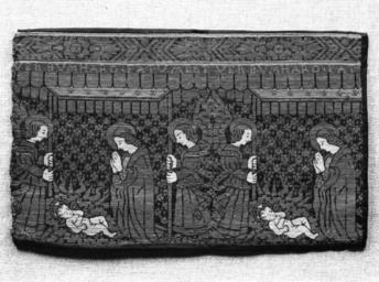 | Keywords: Italian - Border of Brocatelle with Adoration of the Christ Child - Walters 83649.jpg This type of textile is known as a Florentine repeat border fabric woven in long strips then cut and sewn on vestments There is a similar piece in the Metropolitan Museum of Art New York between 1400 1500 Renaissance colored and metal threads with red taffeta lining cm 28 47 7 accession number 83 649 2197 Mrs Saidie A May date and mode of acquisition unknown Walters Art Museum June 12 1945 by gift Gift of Mrs Saidie A May 1945 place of origin Siena Italy Walters Art Museum license Renaissance applied arts in the Walters Art Museum Textiles in the Walters Art Museum Italian art in the Walters Art Museum Media contributed by the Walters Art Museum needs category review Brocatelle textiles 15th-century textiles |