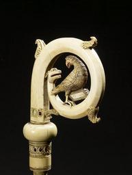 | Keywords: Italian - Crozier Head with the Eagle of Saint John - Walters 71300 - View C.jpg This crosier possibly made in Sicily in the thirteenth century is made of ivory with a depiction of an eagle set inside the crook The curve of the crook is marked with small leaves or tendrils reminiscent of the swirling vines that form the shapes of illuminated initials in some manuscripts from this period The sprouting curve ends in the head of a dragon with his mouth open and ears flattened against his head and perched within this scroll is an eagle the symbol of John the Evangelist The eagle holds a book inscribed with abbreviated forms of the Latin words for John and Evangelist confirming that this is no ordinary bird but a symbol of the Gospel author The eagle turns his head to confront the dragon eye to eye - a depiction of the power of the Word of God to conquer evil The piece is inset with colored glass and there is evidence that parts of it were once set off with gold and paint century 13 Medieval ivory with polychrome and glass inlay cm 19 6 12 1 4 5 accession number 71 300 24336 Henri Daguerre Paris by purchase Henry Walters Baltimore date and mode of acquisition unknown Walters Art Museum Henry Walters Acquired by Henry Walters An Exhibition of the Treasures of The Walters Art Gallery The Walters Art Museum Baltimore; Pace Wildenstein Gallery New York; Smith College Museum of Art Northampton 1967 Ivory The Sumptuous Art The Walters Art Gallery Baltimore 1983-1984 Illuminated Manuscripts Masterpieces in Miniature The Walters Art Gallery Baltimore 1984-1985 Highlights from the Collection The Walters Art Gallery Baltimore 1998-2001 place of origin Sicily Italy Walters Art Museum license Medieval ivory in the Walters Art Museum Italian art in the Walters Art Museum Ivory croziers Media contributed by the Walters Art Museum needs category review |