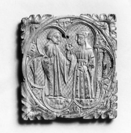 | Keywords: Italian - Mirror Case with the Gift of the Rose - Walters 71281.jpg A couple stands within a hexafoil against a crosshatched ground; a stylized castle is at the right and a tree at the left The man wears a houppelande with wide sleeves; the woman's houppelande is pleated and belted The woman wears a veil on her head and presents her partner with a large rose The spandrels of the hexafoil are filled with masks and the mirror is brought to a square with four corner leaves showing incised veins There are two later holes drilled in the cover The iconography relates this piece to Walters 71 269 between 1390 1400 late Medieval ivory cm 10 8 10 2 accession number 71 281 37260 Caspar Bourgeois and Stephen Bourgeois Cologne date of acquisition unknown by purchase Bourgeois Frères Sale Cologne October 19 1904 no 1082 Henri Daguerre Paris date of acquisition unknown by purchase Henry Walters city Baltimore Walters Art Museum Henry Walters Acquired by Henry Walters 1925 Romance of the Rose Visions of Love in Illuminated Medieval Manuscripts The Walters Art Museum Baltimore 2009 place of origin Milan Italy Walters Art Museum license Italian carved ivory mirror cases in the Walters Art Museum Media contributed by the Walters Art Museum needs category review Courtly love 14th-century carved ivory mirror cases |