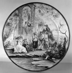 | Keywords: Italian - One of a Pair of Platters with a Pastoral Scene - Walters 481758.jpg This round platter and its pair Walters 48 1759 are painted in blue green yellow ochre tan reddish-brown black grey light purple and vivid pinkish-mauve and are heightened with gold The background depicts a landscape and the rim is dark blue On the platter are a group of peasants resting outside a city wall one on horseback In the center a gypsy is telling a young man's fortune and looking down from a portico at the left are two ladies Both platters are marked in the lower right C C or C G The backs are white late Other date century 18 Baroque earthenware with tin glaze maiolica cm 3 8 46 accession number 48 1758 17102 Don Marcello Massarenti Collection Rome no 411 Henry Walters city Baltimore Walters Art Museum Henry Walters Acquired by Henry Walters with the Massarenti Collection 1902 text place of origin Castelli Italy Walters Art Museum license Baroque art in the Walters Art Museum Italian art in the Walters Art Museum Media contributed by the Walters Art Museum needs category review |
