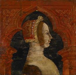| Keywords: Italian - Profile of a Woman - Walters 371849.jpg The woman depicted here in bust-length profile wears the costume of the early 15th century This is surely not a portrait of a particular woman but of a type a pretty young woman The painting is from a large series of similar bust-length profile portraits that would originally have hung in a row decorating the upper walls and possibly the ceiling of a private home The present figure is framed by cusped Gothic architecture The early provenance and style of the group suggest that they were executed by an artist in Lombardy in northern Italy but a specific attribution remains to be clarified For another panel from this series please see Walters 37 1110 Panels from this series belong to the Museo Poldi Pezzoli and to the Museo del Castello Sforzesco in Milan Zeri Italian paintings in the Walters Art Gallery 200 293-294 between 1475 1480 Renaissance paint on wood spruce panel Painted surface H 14 3/16 x W 14 1/2 x D excluding cradle 1/4 in 36 x 36 8 x 0 6 cm accession number 37 1849 4272 Don Marcello Massarenti Collection Rome date and mode of acquisition unknown 1897 catalogue no 344 as School of Umbria or Ancona Henry Walters city Baltimore Walters Art Museum Henry Walters Acquired by Henry Walters with the Massarenti Collection 1902 place of origin Lombardy Italy Walters Art Museum license 2D Renaissance portrait paintings in the Walters Art Museum Italian Renaissance paintings in the Walters Art Museum Italian art in the Walters Art Museum Media contributed by the Walters Art Museum needs category review |