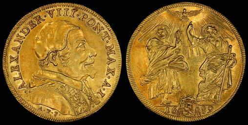 | Keywords: Italy Papal States 1689-I Quadrupla Scudo d'Oro.jpg Pope Alexander VIII obv and Saints Peter and Paul rev engraved by Antonio Travani a goldsmith and medalist in Rome <ref> cite book Forrer L 1916 Biographical Dictionary of Medallists 6 129 Spink Son LTD https //archive org/stream/biographicaldict06forriala page/n11/mode/2up </ref> 1689 coin 2010 image National Numismatic Collection Antonio Travani Papal Mint for the Papal States Use of this image should give credit to the National Numismatic Collection National Museum of American History at the Smithsonian Institution other versions 2013030510011547 Assessments 1 Papal States Pope Alexander VIII 1689 2 Anonymous-EU PD-USGov-SI Uploaded with UploadWizard 2015 User Godot13 NNC coins uploaded by User Godot13 Gold coins of the Papal States Alexander VIII Featured Pictures English Wikipedia by User Godot13 1689 coins NNC coin Featured Pictures English Wikipedia |