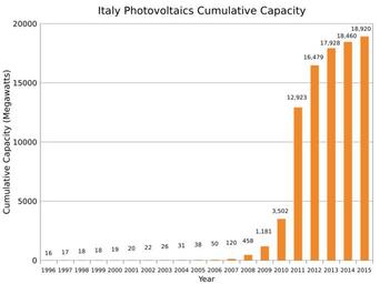 | Keywords: Italy Photovoltaics Installed Capacity.svg translate yes en Cumulative installed photovoltaics in Italy from 1996 to 2015 Sources 2014 http //www iea-pvps org/fileadmin/dam/public/report/technical/PVPS_report_-_A_Snapshot_of_Global_PV_-_1992-2014 pdf 2015 http //www iea-pvps org/fileadmin/dam/public/report/PICS/IEA-PVPS_-__A_Snapshot_of_Global_PV_-_1992-2015_-_Final_2_02 pdf 2014-12-01 own Delphi234 other versions cc-zero Solar energy in Italy Photovoltaic power statistics | ||||