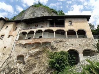 Keywords: italy santa caterina del sasso monastery church building architecture old historical landmark sky clouds stone plants nature outside