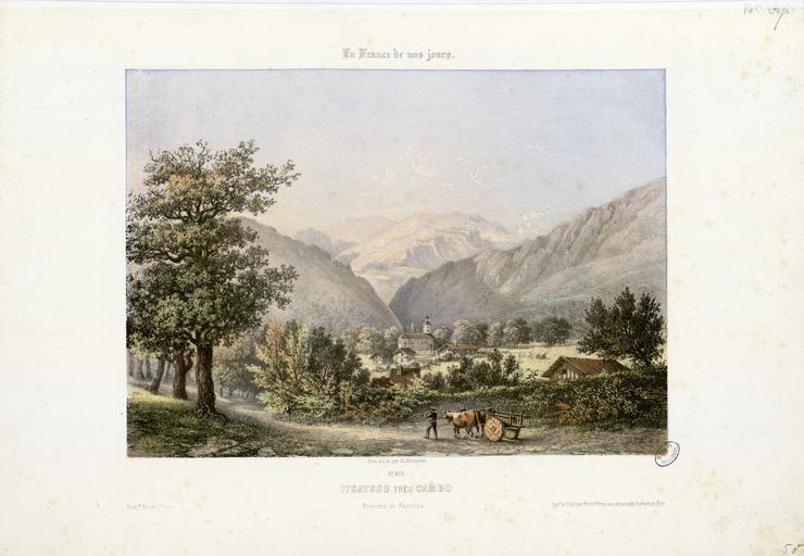 | Keywords: Itsatsou (i.e. Itxatssou) près Cambo - Fonds Ancely - B315556101 A MERCEREAU 7 076.jpg Impression en 3 coul par Frick frères à Paris Fait partie d'un ensemble de recueils de lithographies de Mercereau composés de lithographies provenant de La France de nos jours vaste suite publiée par livraisons de 1853 à 1876 et comprenant 475 planches en deux tirages l'un à deux teintes noir et bistre l'autre en couleurs Les libraires ont réuni ces planches en albums de composition variable quant au nombre de planches et aux dessinateurs Asselineau Mercereau Maurice Deroy etc Un titre Les Pyrénées par Ch Mercereau; Bagnères-de-Luchon par Ch Mercereau était frappé sur le plat supérieur de la reliure de l'album ainsi que le nom du Libraire pour lequel il était réalisé La plupart des recueils de ces planches pyrénéennes portent le nom de Sajous libraire à Bagnères-de-Luchon Pl 1 à 18 numérotées de 370 à 386 Pl 374 pl 5 et 6 en double -- Pl 19 20 et 21 numérotées respectivement 407 415 et 418 Ces trois pl ont été dessinées et lithographiées par Asselineau -- Pl 22 23 et 24 numérotées 438 439 et 440 -- Pl 22 lith par Aubrun -- Pl 25 numérotée 441 -- Pl 26 à 40 numérotées de 327 à 341 -- Pl 41 à 46 numérotées de 363 à 368 -- Pl 47 numérotée 369 -- Pl 48 num 292 -- Pl 49 et 50 num 264 et 265 -- Pl 51 et 52 num 268 et 269 -- Pl 53 à 55 num de 293 à 295 -- Pl 56 num 300 -- Pl 57 à 59 num de 307 à 309 -- Pl 60 à 70 num de 316 à 326 -- Pl 71 num 63 dessin et lith d'Asselineau imprimerie Destouches -- Pl 72 et 73 num 87 et 88 dessin et lith d'Asselineau imprimerie Destouches -- Pl 74 num 124 signée Lebreton éditée chez Lalonde à Paris et imprimée chez Becquet frères à Paris -- Pl 75 num 161 dessin et litho d'Asselineau imprimerie Destouches --Pl 76 à 78 num de 207 à 209 -- Pl 79 à 81 num de 211 à 213 -- Pl 82 num 220 dessin et lith de Maurice imprimerie Destouches -- Pl 83 à 86 num de 226 à 229 -- Pl 87 et 88 num 234 et 235 -- Pl 89 à 91 num de 273 à 275 -- Pl 92 et 93 num 290 et 291 Pièces jointes 6 pl sépia dont certaines sont des doubles du recueil de Mercereau Les cinq premières planches sont numérotées respectivement 318 321 324 331 386 La dernière planche n'est pas extraite de La France de nos jours mais de L'Espagne pittoresque et monumentale Ces six planches sont signées Mercereau éditées chez Sinnet et imprimées chez Frick frères Ancely René 1876 - 1966 Possesseur fre public domain domaine public B315556101_A_MERCEREAU_7_076 jpg image/jpeg 1 f de pl lithogr ; 28 5 cm oblong Sinnet F Éditeur Frick frères Imprimeur http //numerique bibliotheque toulouse fr/collect/general/index/assoc//ark /74899/B315556101_A_MERCEREAU_7_076 dir/B315556101_A_MERCEREAU_7_076 jpg Bibliothèque municipale de Toulouse A-MERCEREAU 7-76 Creator Charles Mercereau http //catalogues toulouse fr/web2/tramp2 exe/do_keyword_search/log_in setting_key BMT1 servers 1home query p001700 St Jean-de-Luz intérieur de l'Eglise St Jean-de-Luz le Château de l'Infante Biarritz Vue générale prise du Phare Château de Mauvesin près Bagnères-de-Bigorre Hautes Pyrénées Bagnères de Bigorre Hautes Pyrénées - Intérieur de l'Eglise des Carmes en couleurs Bagnères de Bigorre Hautes Pyrénées - Intérieur de l'Eglise des Carmes Bagnères-de-Bigorre - Eglise et couvent des Carmes Bagnères-de-Bigorre Hautes-Pyrénées - Tour des Jacobins Cascade et Pont de Magenta Vallée de l'Esponne Hautes Pyrénées Cascade de Trémes-Aïgues Vallée de Grip Hautes Pyrénées St Sauveur Hautes Pyrénées - Le Pont Napoléon Bayonne - Eglise St André Arreau et la Vallée d'Aure Hautes Pyrénées - Vue prise au dessus de la route du Col d'Aspin Auch - Vue prise sur les bords du Gers Auch - Vue de la Cathédrale Auch - Intérieur de la Cathédrale Bagnères-de-Bigorre - Vue Générale prise de la Fontaine ferrugineuse Eaux-Bonnes Basses-Pyrénées - L'établissement Thermal et la Chapelle Nantes - Vue de l'Eglise Ste Croix Le Croisic - Plage des Baigneurs et Etablissement de Bains Le Folgoët - Vue de l'Eglise Brèche de Roland prise de Gèdres Hautes Pyrénées Eglise des Templiers à Luz Chapelle du couvent de Pouëlahun i e Pouey Lahun - Vallée d'Azun Hautes Pyrénées Le Pont de Scia - Route de Luz à Gavarnie Hautes-Pyrénées Vue de l'établissement de la Raillière près Cauterets Hautes-Pyrénées Vue générale de Cauterets prise du Mamelon Vert Hautes-Pyrénées Vue du Fort de Lourdes Hautes-Pyrénées Vue d'Argelès-de-Bigorre Hautes-Pyrénées Vue de St Sauveur Hautes-Pyrénées Le Pas de l'Echelle Route de Gavarnie Hautes-Pyrénées Fond de la Vallée d'Argelès prise de la terrasse de St Savin Hautes-Pyrénées Place Grammont à Pau Basses-Pyrénées Vue générale des Eaux-Bonnes Basses-Pyrénées Barèges et la Vallée du Bastan Hautes-Pyrénées Chute supérieure du Pont d'Espagne Hautes-Pyrénées La grotte miraculeuse à Lourdes Hautes-Pyrénées Eglise de Bétharram et Pont de Lestelle Basses Pyrénées Cascade du Cerizet Près Cauterets Hautes-Pyrénées Pic du Midi d'Ossau 2885m Basses Pyrénées - Vue prise du 3e plateau de Bious-Artigues Toulouse - Cloître du Musée et Clocher des Augustins Pau - Vue prise de la terrasse du Château Pau - Vue du Château prise du Parc Toulouse - Cloître du Musée Galerie du Moyen-Age Toulouse - La maison de pierre fragment de la façade Toulouse - Intérieur de St Sernin St Jean-de-Luz Fort du Socoa Toulouse - Vue du Capitole Bordeaux Vue de la Porte du Caillau i e Cailhau Bordeaux Porte de la grosse Cloche Bordeaux Vue des Quinconces Bordeaux - Vue de la Tour et de l'Eglise de St Michel Toulouse - Vue du Pont de pierre prise du Quai de Brienne Toulouse - Abside de l'Eglise de St Sernin de l'an 1097 Toulouse - Choeur de la Cathédrale St Etienne Rouen - Hôtel de Bourgtheroulde Biarritz - Vue des Bains Napoléon et du Casino Biarritz - Vue des Bains du Port Vieux Biarritz - Vue de l'Entrée de la Ville à l'ar