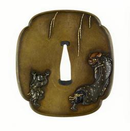 Keywords: Iwamoto Konju - Tsuba with Lion Dancers - Walters 51105.jpg The lion dance is usually performed as part of the New Year's celebrations On this tsuba two performers dance in the lion costume along with a third masked figure who is also part of the dance The lion dance tradition developed in China from a belief that the dance would protect villages from evil spirits Stylized lions such as this are known as Chinese lions shishi in Japan A willow tree decorates the back and its boughs also appear in the upper portion of the front side The tsuba is signed with a seal on the reverse 1815 late Edo sentoku shibuichi with gold silver and copper detail cm 7 7 7 03 0 42 accession number 51 105 35471 Henry Walters Baltimore date and mode of acquisition unknown Walters Art Museum 1931 by beqeust Acquired by Henry Walters Seal Konju place of origin Edo present-day Tokyo Japan Walters Art Museum license Tsuba in the Walters Art Museum Iwamoto Konju Media contributed by the Walters Art Museum needs category review Reliefs of dancers on Japanese sword fittings