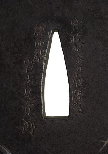 Keywords: Iwamoto Konkan - Tsuba with Marishiten - Walters 51253 - Mark A.jpg Standing on a charging bull at the right side of this tsuba is the Buddhist deity Marishiten She is known as the Queen of Heaven despite her masculine appearance She has three faces Her six arms normally eight carry a sword a bow and arrow and a spear She is believed to reside in the stars of Ursa Major The inscription on the front says that it was presented by the Suwa clan by orders of the ruler The Suwa clan controlled the area that is now Nagano prefecture The reverse has two Suwa oak leaf crests 1793 Edo iron silver gold copper shakudo cm 8 9 8 5 0 59 accession number 51 253 25631 Henry Walters Baltimore date and mode of acquisition unknown Walters Art Museum Henry Walters Acquired by Henry Walters Dedication Suwa uji tatematsuru kunmei; Date Kansei go mizu-no-to ushi toshi yƓfuku ; Signature kin ji sen Iwamoto Konkan; Translation Presented to the Suwa clan by orders of the ruler / Fifth year of Kansei 1793 the year of the ox November / Respectfully engraved by Iwamoto Konkan kao place of origin Edo present-day Tokyo Japan Walters Art Museum license Tsuba in the Walters Art Museum Iwamoto Konkan Media contributed by the Walters Art Museum needs category review |