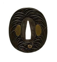 | Keywords: Iwamoto Konkan - Tsuba with Autumn Grasses and Insects - Walters 51382.jpg This tsuba is dominated by pampas grass a traditional indication of autumn At the lower right and the bottom are chrysanthemum flowers A moth is at the upper right A similar scene of pampas is depicted on the reverse with chrysanthemums at the bottom between 1744 1801 mid Edo silver alloy gold alloy with gilt gold and gilt copper cm 6 9 accession number 51 382 14249 Henry Walters Baltimore date and mode of acquisition unknown Walters Art Museum Henry Walters Acquired by Henry Walters Signature Iwamoto Konkan place of origin Edo present-day Tokyo Japan Walters Art Museum license Tsuba in the Walters Art Museum Iwamoto Konkan Media contributed by the Walters Art Museum needs category review |