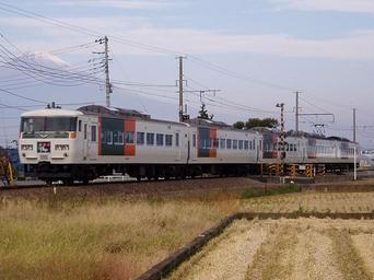 Keywords: Izuhakone-Odoriko.jpg JR East 185 series EMU on an Odoriko service on the Isuhakone Railway between Baraki and Nirayama Own 2007-11-26 Cassiopeia_sweet Izuhakone Railway Sunzu Line JNR 185 Trains with Mount Fuji Odoriko train