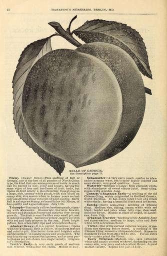 | Keywords: J.G. Harrison and Sons nurseries (16776262642).jpg <br> Troth's Early A very early peach of medium <br> size whitish with a fine red cheek Middle of July <br> Schumacher A very early peach similar to Alex- <br> ander in many ways but is more highly colored and <br> more showy very good qualities June <br> Waterloo Medium to large; flesh greenish white <br> with abundance of sweet vinous juice Semi-cling <br> ripens with Amsden June <br> Connett's Southern Early A seedling of the old <br> Chinese Cling which originated in Guilford County <br> North Carolina It has extra large fruit of a cream <br> white shade ; having a beautiful blush next to t he sun <br> Eureka Early semi-cling; seedling of Chinese <br> cling Medium size oblong cream white with red <br> blush; tender and juicy when fully ripe clear seed <br> delicious flavor Ripens at place of origin in I ouisi- <br> ana June 15th <br> Arkansas Traveler Seedling of the Amsden June <br> and ripens earlier ; medium to large ; color red flesh <br> white with a delicious flavor <br> Victor One of the earliest varieties known of me- <br> dium size ripening before Sneed A seedling of the <br> Chinese Cling crossed with Spanish blood Ripens in <br> Southern Texas from May 8th to 16th For an extra <br> early variety plant the Victor <br> Early Tillotson Medium size skin yellowish <br> white and nearly covered with red darkening on the <br> sunny side very juicy and of excellent flavor A good <br> market variety Ripens first part of July 43766119 148656 77544 Page 12 Text http //www biodiversitylibrary org/page/43766119 1904 10 5962/bhl title 77544 Harrison's Nurseries Berlin Md ; Henry G Gilbert Nursery and Seed Trade Catalog Collection NameFound Medium NameConfirmed Medium NameBankID 4904049 NameFound Origina Biodiversity Heritage Library J G Harrison Sons nurseries Garden Stories Catalogs Harrison's Nurseries Berlin Md Nurseries Horticulture Seeds U S Department of Agriculture National Agricultural Library bhl page 43766119 dc identifier http //biodiversitylibrary org/page/43766119 bhlGardenStories Belle of Georgia apple BHLinbloom harrison's nurseries berlin md nurseries horticulture u s department of agriculture national agricultural library bhlgardenstories belle of georgia apple bhlinbloom Information field Flickr posted date ISOdate 2015-03-10 CC-BY-2 0 BioDivLibrary https //flickr com/photos/61021753 N02/16776262642 2015-08-24 01 54 34 cc-by-2 0 PD-old-70-1923 J G Harrison Sons nurseries Photos uploaded from Flickr by FĂŚ using a script |
