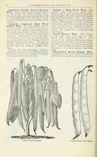Keywords: J. Steckler Seed Co., Ltd. garden manual 1900 (16573012555).jpg 30 <br> J STECKXER SEED CO LTD ALMANAC AND <br> Improved Prolific Dwarf German <br> Wax This variety is a great improvement <br> on its parent the Dwarf German Wax <br> Pods are longer and more productive with <br> the good qualities of the old kind which <br> was the first Wax Bean introduced here from <br> Germany <br> Grenell's Improved Rust Proof <br> Golden Wax An improvement on the <br> Dwarf Golden Wax Bean; the seed is <br> identically the same in color as that kind <br> The pods are straight long and fleshier <br> than Golden Wax superior in quality and <br> positively Rust Proof - quite an object <br> with us here in the South when we often <br> have rainy weather in the Spring which is <br> injurious to most wax beans The origina- <br> tor also claims it to be more prolific and <br> hardier than the ordinary Golden Wax <br> Bean <br> We had this bean thoroughly tried and <br> found it so superior to the ordinary Golden <br> Wax that we have concluded to drop the <br> last named varit-tv from our list <br> Detroit or Rust Proof Wax This <br> splendid wax bean is of recent intro- <br> duction and is very productive and hard 7 ; <br> pods straight flat and somewhat broader <br> than the Dwarf Golden Wax The beans <br> when well grown are of a beautiful golden <br> yellow The originator claims that when <br> tried side by side with the majority of wax <br> beans it had never spotted or -rusted ' <br> while most of the other varieties were un- <br> salable He claims it to be the best bean <br> for shipping <br> Dwarf Butter Wax This variety <br> is also sold under the name of Bis- <br> marck ' and Rust Proof Wax It is <br> very early an excellent ltearer pods simi- <br> lar in shape to the Ward well's Dwarf Kid- <br> ney Wax; they are very brittle and of fine <br> flavor Not as liable to rust as other kinds <br> The seed is of a dark purple color when <br> dried <br> Wardwell's Dwarf Kidney Wax <br> Undoubtedly the best dwarf Wax Bean in <br> cultivation; it is quite early; the pods are of <br> Pride of Newton Beans <br> Dwarf Golden Wax Beans 43933603 150250 78709 Page 30 Text http //www biodiversitylibrary org/page/43933603 1900 10 5962/bhl title 78709 Henry G Gilbert Nursery and Seed Trade Catalog Collection ; J Steckler Seed Co Biodiversity Heritage Library J Steckler Seed Co Ltd garden manual 1900 dealers in vegetable flower field and grass seeds Garden Stories Catalogs J Steckler Seed Co Seed industry and trade Seeds Trade catalogs Vegetables U S Department of Agriculture National Agricultural Library bhl page 43933603 dc identifier http //biodiversitylibrary org/page/43933603 bhlGardenStories Pride of Newton Beans BHLinbloom j steckler seed co u s department of agriculture national agricultural library bhlgardenstories pride of newton beans bhlinbloom Information field Flickr posted date ISOdate 2015-02-18 CC-BY-2 0 BioDivLibrary https //flickr com/photos/61021753 N02/16573012555 2015-08-24 02 52 55 cc-by-2 0 PD-old-70-1923 J Steckler Seed Co Ltd garden manual 1900 Photos uploaded from Flickr by Fæ using a script |
