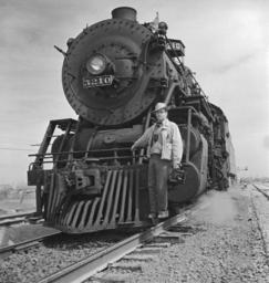 | Keywords: Jack Delano - Jack Delano, Farm Security Administration Office of War Information photographer, full-length portrait, holding camera, standing on front of locomotive.jpg Jack Delano Farm Security Administration/Office of War Information photographer full-length portrait holding camera standing on front of locomotive Medium 1 photographic print gelatin silver Reproduction Number LC-USZ62-120966 b w film copy neg Rights Advisory May be restricted Information on reproduction rights available in LC P P Restrictions Notebook Call Number Unprocessed item P P Repository Library of Congress Prints and Photographs Division Washington D C 20540 USA Notes Title devised by cataloger Unprocessed in PR 13 CN 1998 032 6 ~ 1943 author PD-USGov 1943 in rail transport in the United States Jack Delano Steam locomotives of the United States United States in the 1940s Atchison Topeka and Santa Fe Railway steam locomotives 2-8-2 locomotives |