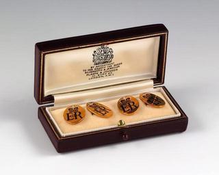| Keywords: Jack Ford's cufflinks.JPG en Set of four gold-tone cufflinks given to Jack Ford by Queen Elizabeth II during America ™s Bicentennial celebrations The cufflinks feature an enamel cipher of the British crown over the initials EIIR Enclosed in a velvet-lined maroon leather box embossed with the crown Gift of Queen Elizabeth II on July 7 1976 Gerald R Ford Presidential Museum 1976 n/a Institution Institution Gerald R Ford Presidential Museum Accession Number 1988 971 Dimensions 2 x 3 75 x 2 25 Gerald R Ford Presidential Library and Museum-cooperation PD-USGov Jack Ford Gifts of heads of state in the Gerald R Ford Presidential Museum Cufflinks |