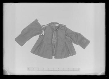 | Keywords: Jacka av svart sidenrips - Livrustkammaren - 78654.tif LSH artwork sv Tillhört Karl X Gustav 1622-1660 Den stackota jackan har 6 skört d v s fram- och bakstyckena är hela och långa och endast i sidorna har man skarvat in ett svängt skörtstycke ovanför vilket ytterligare ett litet stycke sytts mellan framstyckets utdragna vinge ärmringningen och bakstycketssidosöm Jackan har knapphål hela vägen på vänster framkant d v s det finns 36 st ca 3cm långa knapphål varav de 12 nedersta inte kunnat användas då fodret på detta ställe gårut i kanten Samma antal knappar finns på högra sidan Knapparna är av trä överklädda medsvart tagel som bildar mönstret av en 6-uddig stjärna Stadkanten går fasten delvisbortklippt i framkanterna Ärmarna har sytts vardera av 2 stycken och de är öppna i denfrämre sömmen I den bakre sitter vid uppslagen 2 knapphål Endast en motsvarande knapp finns kvar på vänster ärm medan båda finns kvar på höger Utefter de öppna kanterna sitterpå understycket 21 knapphål 2 5 cm långa och sydda med svart högertvinnat silke 6stygn/cm Till dessa finns på vänster ärms överstycke 17 knappar i behåll och på höger 16st Men 4 knappar ser ut att saknas på båda ärmarna <br/>Vänster framstyckes bakre skörtkant har 19 3 cm långa knapphål och lika många knapparfinns på sidoskörtets främre del dock kan bara de 3 översta knäppas då fodret täcker påinsidan de övriga knapphålen På sidoskörtets bakre kant sitter 17 knappar svarande mot de17 knapphålen i bakstyckets främre sidokant Här kan också endast de 3 översta knäppas Mitt bak finns på vänster stycke 18 knappar till samma antal knapphål varav de 2 överstakan knäppas På den främre kanten av detta skört sitter 17 knapphål passande till likamånga knappar på högra sidostyckets kant de 3 översta kan knäppas På främre kanten avsidostycket sitter 19 knappar passande till samma antal knapphål i högra framstyckets bakresida varav de 2 översta kan knäppas Kragen är sydd av 2 snedskurna bitar av tyget som sytts ihop ungefär mitt bak Dess längdupptill är 51 cm nertill vid fastsyningen 53 cm Den är mitt fram 4 5 cm hög och har 2något mindre knappar av annan utformning än de övriga i plagget samt 2 tränsar av svartsilke Mitt bak är kragen knappt 3 5 cm hög I kragen ligger grov mörkbrun kanfas 13x12tr/cm2 som styvnad Jackan har på högra bakstycket en platt slät knapp placerad 1 5 cmfrån axelsömmen och 5 cm från kragsömmen Den är 1 5 cm i diameter och klädd med svart taft på trästomme Den har med största sannolikhet tjänat som fäste för kappbandet Jackan harett mellanfoder av grov grå linnelärft 16x16 tr/cm2 dock ej i ärmarna I dessa troligenmellanfoder endast nertill vid ärmuppslagen Dess innerfoder utgörs av svart moiré Vådbredden är minst ca 64 cm ty man kan ej härskönja spår av veck från moirébehandlingen Då vecket torde legat mitt i tyget har man häralltså klarat sig med mindre än den förmodade halva tygbredden ca 33 á 34 cm 40x26tr/cm2 Stad 0 6 cm 8 gula 4 röda 4 gula 4 röda 8 gula 1 svart tråd tuskaftsbindning Inga spår efter hängslen syns - märkligt nog - i jackan Detta kan beropå att dess foder som helhet är mycket defekt delvis söndersprättat och trasigt Jackan ärgarnerad med en 4 5 cm bred svart knypplad spets av lingarn i ett mycket smått ochhopträngt mönster Den sitter i 2 rader utefter den raka nederkanten - utan pie - påinsidan av ärmarna för att bilda de eleganta uppslagen Spetsen har sytts på så att den ihela uppslaget sidorna och nederkanten går i en veckad kant som når ca 2 cm utanförärmen Varje veck drar ca 3 ½ gång av materialet I själva den raka nederkantens del har man ovanför kantspetsen lagt en rad spets nu nästanslät blott en aning löst rynkad Beräknad spetsåtgång till en ärm ca 3 meter Ärmarna ärhopsydda så att överärmstycket lagts ovanpå underärmsstycket Innan ärmarna sytts i harärmhålen kantats med passpoal Mitt bak har höger stycke lagts på vänster och i sidorna harbakstyckena lagts på de främre Höger ärm hade lossnat helt men efter fotografering syttsfast 1955 original caption - 1654 1660 silk Färg svart d1 - dräkt - yttermaterial material siden - silk Färg svart d2 - dräkt - foder material siden size mm 600 mitt fram size mm 580 mitt fram size mm 650 rygg mitt bak size mm 430 rygg size mm 340 skört fram size mm 320 skört sida size mm 290 skört bak size mm 150 axel size mm 590 ärm size mm 490 ärm size mm 395 ärm nedtill size mm 330 ärmslits från ärmhål och nedåt size mm 170 sprund i ärmens nedkant LRK Karl X Gustav av Sverige place of origin original filename LN_B13219_016099 55558 inventory number LRK 19023 78654 CC0 Jacka av svart sidenrips - Livrustkammaren - 78654-negative tif <gallery caption Different images of same object > File Svart tröja i sidenrips med foder i sidenmoiré - Livrustkammaren - 86715 tif File Svart tröja i sidenrips med foder i sidenmoiré - Livrustkammaren - 86714 tif </gallery> Shirts Media contributed by LSH unmatched material Media contributed by LSH dim-with multiple size templates Clothing in Livrustkammaren Media contributed by LSH 2013-10 |