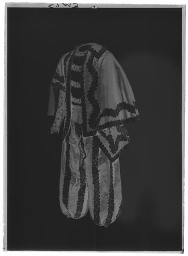 | Keywords: Jacka, "Bohemiens klädning" - Livrustkammaren - 53279-negative.tif LSH artwork sv Jacka av svart atlas formsydd i fyra stycken Knäppning fram med fyra knappar klädda i rosa siden på högra stycket diameter 15 mm Två sprund nedtill i sidorna längd 195 mm och ett mitt bak längd 185 mm Dekor i form av vågklippta veckade längsgående rosa sidenband med spridda silverpaljetter <br/>Korta vida ärmar som är veckade upptill <br/>Foder i benvitt linne tuskaft Kanterna fodrade i rosa siden <br/>Gåva tillsammans med gnr 17/46-17/192 av H M Konungen Gustav V genom chefen för Kungliga Husgerådskammaren original caption end other date century 18 silk Färg svart rosa d1 - dräkt - yttermaterial material sidenatlas - silk Färg rosa d2 - dräkt - foder material siden - silk Färg rosa d5 - dräkt - knappar och spännen material siden - sequins Färg silver d1 - dräkt - yttermaterial material paljetter - linen Färg benvit d2 - dräkt - foder material linne size mm 735 bak size mm 430 size mm 300 ärm g 507 LRK place of origin original filename LN_B16286_019166 57527 inventory number LRK 21500 53279 CC0 Jacka Bohemiens klädning - Livrustkammaren - 53279 tif <gallery caption Different images of same object > File Jacka Bohemiens klädning - Livrustkammaren - 61840 tif File Jacka Bohemiens klädning - Livrustkammaren - 44718 tif File Jacka Bohemiens klädning - Livrustkammaren - 36160 tif File Jacka Bohemiens klädning - Livrustkammaren - 70373 tif </gallery> |