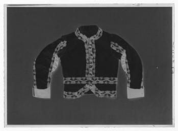 | Keywords: Jacka till Serafimerordensdräkt - Livrustkammaren - 35668-negative.tif Midjekort jacka av vitt siden med isydd lång ärm och knäppning mitt fram i form av 13 svarta välvda räfflade knappar överspunna med svart silke Jackan kantad med 60 mm bred genombruten svart spets Ryggstycket skuret med figursömmar samt ryggsöm Denna och de övriga sömmarna belagda med svart spets Mittbak 70 mm långt sprund två likadana i de övriga sömmarna bak <br/><br/>Ärmsömmarna belagda med svart spets Nedtill slag av svart siden b 70 mm uppdraget i en spets mittfram Samt med sprund l 80 mm med ett knapphål I främre ärmsömmen mitt för armvecket ett halsfäriskt rynkat sidenstycke l 160 mm <br/><br/>Foder av gulvit bomull På vänster sida innerficka Utmed framkanterna mörkblått siden Hela jacka vadderad original caption decade 1840 silk Färg vit d1 - dräkt - yttermaterial material siden - silk Färg svart d5 - dräkt - knappar och spännen material silke - lace Färg svart d4 - Dräkt - passpoaler band kantning uppslag material spets - cotton Färg gulvit d2 - dräkt - foder material bomull size mm 555 fram size mm 550 bak size mm 610 ärm LRK Magnus F F Björnstjerna greve general place of origin original filename LN_B11364_014244 51775 inventory number LRK 15224 35668 CC0 Jacka till Serafimerordensdräkt - Livrustkammaren - 35668 tif <gallery caption Different images of same object > File Jacka till Serafimerordensdräkt - Livrustkammaren - 44227 tif </gallery> |