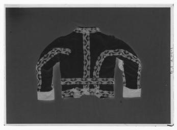 | Keywords: Jacka till Serafimerordensdräkt - Livrustkammaren - 44227-negative.tif Midjekort jacka av vitt siden med isydd lång ärm och knäppning mitt fram i form av 13 svarta välvda räfflade knappar överspunna med svart silke Jackan kantad med 60 mm bred genombruten svart spets Ryggstycket skuret med figursömmar samt ryggsöm Denna och de övriga sömmarna belagda med svart spets Mittbak 70 mm långt sprund två likadana i de övriga sömmarna bak <br/><br/>Ärmsömmarna belagda med svart spets Nedtill slag av svart siden b 70 mm uppdraget i en spets mittfram Samt med sprund l 80 mm med ett knapphål I främre ärmsömmen mitt för armvecket ett halsfäriskt rynkat sidenstycke l 160 mm <br/><br/>Foder av gulvit bomull På vänster sida innerficka Utmed framkanterna mörkblått siden Hela jacka vadderad original caption decade 1840 silk Färg vit d1 - dräkt - yttermaterial material siden - silk Färg svart d5 - dräkt - knappar och spännen material silke - lace Färg svart d4 - Dräkt - passpoaler band kantning uppslag material spets - cotton Färg gulvit d2 - dräkt - foder material bomull size mm 555 fram size mm 550 bak size mm 610 ärm LRK Magnus F F Björnstjerna greve general place of origin original filename LN_B11365_014245 51775 inventory number LRK 15224 44227 CC0 Jacka till Serafimerordensdräkt - Livrustkammaren - 44227 tif <gallery caption Different images of same object > File Jacka till Serafimerordensdräkt - Livrustkammaren - 35668 tif </gallery> |