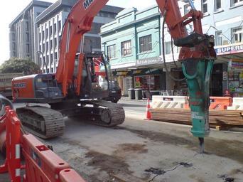 | Keywords: Jackhammer On An Excavator End.jpg jackhammer breaking the road surface in Grafton Auckland New Zealand in preparation for a new sewage pipe to go into Park Road as part of the works around the Central Connector Busway Raupenbagger gebundener Presslufthammer öffnet eine Straße in Grafton Neuseeland als Vorbereitung zur Verlegung einer neuen Abwasserleitung in der Nähe des Central Connector Busway self-photographed 2008-10 Uploader -36 8607766 174 768464 Photos taken by Ingolfson Streets in Auckland Grafton New Zealand Hydraulic jackhammers Noise pollution Hitachi Zaxis 200 Roadworks in New Zealand 2008 in New Zealand Construction vehicles in New Zealand |