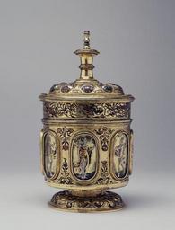 | Keywords: Jacob Fröhlich - Beaker with a Sundial - Walters 58220.jpg This lidded beaker or cup is actually a timepiece More precisely it is an elaborate and rare type of sundial that is quite accurate Time is measured by the shadow of the tip of the gnomon the vertical rod inside the cup indicating the hours along the spiraling lines engraved around the side wall This tells two versions of the time according to different systems Arabic numbers mark lines indicating German hours which are like ours 24 of the same length making up one day Roman numerals mark the planet hours within one day the period of daylight is divided into 12 hours which change in length with the seasons At the time this timepiece was made the older planet-hour system was rapidly being replaced given a new emphasis on the mechanization of the clock with its hours of equal length The system of vertical lines and points marked by the signs of the zodicac- such as the crab for Cancer- indicates the date As well as telling the time there is a scale between the two types of numbers that established the height of the sun Finally a chamber under the base once housed a compass making this a multipurpose scientific instrument With its engraved decoration and reverse painted glass insets- with the days of the week represented by the seven planetary gods based on woodcuts by the German master Virgil Solis- this is a splendid example of Nuremberg goldsmith work Indeed the city's coat of arms featuring the Habsburg double-headed eagle is on the cap to the chamber under the base at left The beaker was probably made as an official present from the city The initial recipient may have been Francis of Padua identified in the inscription on the underside of the cover as a physician working in the Italian city of Forli but who is otherwise unknown ca 1560 Renaissance amelierung gilt on brass reverse-painted glass and colored resins cm 16 3 accession number 58 220 774 Raoul Heilbronner Paris by purchase Henry Walters Baltimore 1908 by purchase Walters Art Museum Henry Walters Acquired by Henry Walters 1908 World of Wonder The Walters Art Gallery Baltimore 1971-1972 place of origin south Nuremberg Germany Walters Art Museum license Renaissance clocks Portable sundials Renaissance applied arts in the Walters Art Museum Media contributed by the Walters Art Museum needs category review Media contributed by the Walters Art Museum needs artist review |