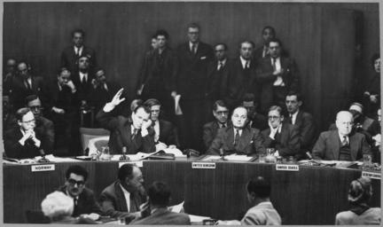 | Keywords: Jacob A. Malik, representative on the Soviet Union on the United Nations Security Council, raises his hand to cast... - NARA - 541950.tif Scope and content General notes Use War and Conflict Number 1373 when ordering a reproduction or requesting information about this image 541950 Local identifier 306-PS-50 15266 U S Information Agency 1982 - 10/01/1999 Most Recent <br /> International Communications Agency Press and Publications Service Publications Division 1978 - 1982 Predecessor <br /> U S Information Agency Press and Publications Service Visual Services Branch Photo Library ca 1953 - ca 1978 Predecessor Still Picture Records Section Special Media Archives Services Division NWCS-S National Archives at College Park 8601 Adelphi Road College Park MD 20740-6001 1948 - 1983 Record group Record Group 306 Records of the U S Information Agency 1900 - 2003 Record group ARC 622 Master File Photographs of U S and Foreign Personalities World Events and American Economic Social and Cultural Life compiled ca 1953 - ca 1994 documenting the period ca 1900 - ca 1994 Series ARC 541937 File unit File unit ARC Variant control numbers NAIL Control Number NWDNS-306-PS-50 15266 yes Other versions NARA-cooperation PD-USGov Public speaking at the United Nations Korean War in 1950 December 1950 in the United States People of the Soviet Union in 1950 1950 in international relations December 1950 photographs |