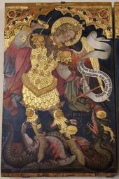 | Keywords: Jacobello da fiore, trittico, 1400-30 ca. 02.JPG Art photo Q27077942 Creator Jacobello Del Fiore title Justice between the Archangels Michael and Gabriel La Giustizia in trono tra gli arcangeli Michele e Gabriele <br> alternate title title Triptych of Justice Trittico della Giustizia it Gallerie dell'Accademia - MIBAC Supported by Wikimedia CH Images by Sailko - Supported by Wikimedia CH 0270422853-MIBAC 2014 en Justice seated between two lions and the archangels Michael and Gabriel She holds her attributes sword and scales it simbolo della Divina Sapienza tra due leoni che rimandono al trono di Salomone La Giustizia regge con la destrala spada e porta con la sinistra la bilancia San Michele sorregge la bilancia e trasfigghe il drago L'angelo guerriero e difensore della chiesa - nella sua duplice funzione di pesatore di anime e di combattente contra il drago simbolo di Satana 1421 Tempera on panel size cm 208 490 LangSwitch Mittelteil central panel centre/panneau central middenpaneel cm 208 194 ; Saint Michel cm 208 133 ; Saint Gabriel cm 208 163 Institution Gallerie dell'Accademia Venice 01 01 http //www gallerieaccademia it/sale/sala-i Gallerie dell'Accademia<br>Richard Hunter S P Oakley Latin Literature and its Transmission https //books google de/books id A6fZCgAAQBAJ pg PA178 lpg PA178 dq Jacobello+del+fiore+Justice+between+the+Archangels+Michael+and+Gabriel source bl ots WGbh7hEoFM sig tvNmvN_O702pDIBvEUkwy3SFFAM hl de sa X ved 0ahUKEwiczeqc2azOAhVIthQKHd6QBf0Q6AEIZjAN v onepage q Jacobello 20del 20fiore 20Justice 20between 20the 20Archangels 20Michael 20and 20Gabriel f false books google object history it eseguito per la sede del Magistrato del Proprio in Palazzo Ducale credit line en above the head of the left lion Artist's name and date Fiore pinxit 1421 1000 years after the legendary founding of Venice <br> it Le parole dietro la Giustizia Eseguirò gli ammonimenti degli angeli e le parole sacre blanda con i pii nemica dei malvagu e superba con gli orgogliosi sono generalmente attribuite a CristoGiudice nell'arte nordica É evidente l'identificazione della Giustizia con Venezia rappresentata anche nel rilievo sula faciata ouest di Palazzo Ducale L'importante commissione mostra 'influenza di Gentile da Fabriano La cornice presenta sull'estrema destra lo stemma di Tommaso Mocenigo doge 1414-1423 Gabriel Virginei partus humanae nuncia pacis<br>Vox mea virgo ducem rebus te poscit opacis<br> my voice which announces the virgin's birth demands you virgin as leader for your gloomy affairs <br> en The inscriptions are political and religious as the 25th of March is the date of Annunciation and of the legendary founding of Venice accession number cat 15 artwork license PD-old-100-1923 photo date 2013-09-10 11 20 38 own photo license cc-by-sa-3 0 it DEFAULTSORT Jacobello Del Fiore Justice between the Archangels Michael and Gabriel Jacobello Del Fiore - Justice between the Archangels Michael and Gabriel - Accademia Venice D02 Paintings of Saint Michael in Italy 15th-century paintings of Saint Michael Paintings of men with swords Scales in art Paintings Jacobello Del Fiore Justice between the Archangels Michael and Gabriel Images from Wiki Loves Monuments 2014 Images from Wiki Loves Monuments 2014 in Italy needing check Images from Wiki Loves Monuments 2014 in Italy Uploaded via Campaign wlm-it Images by Sailko - Supported by Wikimedia CH Photographs by User Sailko |