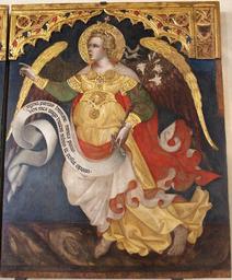 | Keywords: Jacobello da fiore, trittico, 1400-30 ca. 03.JPG Art photo Q27077942 Creator Jacobello Del Fiore title Justice between the Archangels Michael and Gabriel La Justicia entre los arcángeles Miguel y Gabriel Giustizia tra gli arcangeli Gabriele e Michele <br> alternate title title Triptych of Justice Trittico della Giustizia it Gallerie dell'Accademia - MIBAC Supported by Wikimedia CH Images by Sailko - Supported by Wikimedia CH 0270422853-MIBAC 2014 en Justice seated between two lions and the archangels Michael and Gabriel She holds her attributes sword and scales it simbolo della Divina Sapienza tra due leoni che rimandono al trono di Salomone La Giustizia regge con la destrala spada e porta con la sinistra la bilancia San Michele sorregge la bilancia e trasfigghe il drago L'angelo guerriero e difensore della chiesa - nella sua duplice funzione di pesatore di anime e di combattente contra il drago simbolo di Satana 1421 Tempera on panel size cm 208 490 LangSwitch Mittelteil central panel centre/panneau central middenpaneel cm 208 194 ; Saint Michel cm 208 133 ; Saint Gabriel cm 208 163 Institution Gallerie dell'Accademia Venice 01 01 Institution Gallerie dell'Accademia Venice 01 01 http //www gallerieaccademia it/sale/sala-i Gallerie dell'Accademia<br>Richard Hunter S P Oakley Latin Literature and its Transmission https //books google de/books id A6fZCgAAQBAJ pg PA178 lpg PA178 dq Jacobello+del+fiore+Justice+between+the+Archangels+Michael+and+Gabriel source bl ots WGbh7hEoFM sig tvNmvN_O702pDIBvEUkwy3SFFAM hl de sa X ved 0ahUKEwiczeqc2azOAhVIthQKHd6QBf0Q6AEIZjAN v onepage q Jacobello 20del 20fiore 20Justice 20between 20the 20Archangels 20Michael 20and 20Gabriel f false books google object history it eseguito per la sede del Magistrato del Proprio in Palazzo Ducale; acquisizione 1884 con le soppressioni credit line accession number Cat 15 photo date 2013-09-10 13 33 25 own Sailko photo license cc-by-sa-3 0 it PD-old-100-1923 DEFAULTSORT Jacobello Del Fiore Triptych 10 Accademia Galleries Venice Jacobello Del Fiore - Justice between the Archangels Michael and Gabriel - Accademia Venice D12 Details of Italian Gothic paintings Details of 15th-century paintings Paintings of Saint Gabriel Paintings with Latin inscriptions 15th-century paintings of Saint Gabriel Images by Sailko - Supported by Wikimedia CH Images from Wiki Loves Monuments 2014 in Italy Photographs by User Sailko Uploaded via Campaign wlm-it Images from Wiki Loves Monuments 2014 Images from Wiki Loves Monuments 2014 in Italy needing check |