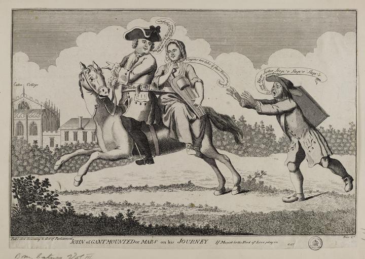 | Keywords: Jacobite broadside - John of Gant Mounted or Mars on his Journey If Musick be the Food of Love Play on.jpg 13 3/4x 9 A picture of the Duke of Cumberland and his Savoyard girl on a horse with the brother of the girl calling out after in horror My Dear Sister Stop 'e Stop 'e Stop 'e O I fear she's gine for aye The Duke and the girl are attached by The Girdle of Affection and he says My al is in my possession and she says Virgins are like ye fair flowers in its Lustre Size cm 22 22 exhibition history Institution National Library of Scotland Prints and broadsides object history object type PD-old-70-1923 place of creation Blaikie SNPG 75241535 Jacobite broadside - John of Gant Mounted or Mars on his Journey If Musick be the Food of Love Play on Uploaded with GWToolset Jacobite broadside - John of Gant Mounted or Mars on his Journey If Musick be the Food of Love Play on http //deriv nls uk/56YK98Q/7524/75241537 2 jpg Images uploaded as part of NLS-WMUK collaboration Jacobite broadsides |
