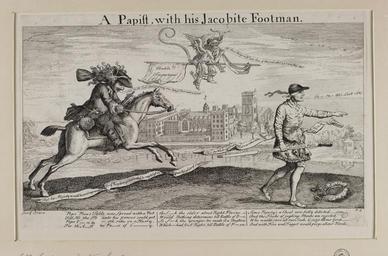 | Keywords: Jacobite broadside - Papist with his Jacobite Footman.jpg 11 7/8x 6 5/8 Picture of man on horseback saying Let us do Evil that food may come Whole Damnation is just with a footman in front saying Oh-Oh-All's Lost-oh And other banners around him and holding a stick Indefeisible Hereditary Right and a sort of miniature angel with boots and spurs and a tail rides a banner Tandem Triumphans and says All these things will I give them if thou wilt fall down and worship me there is a town in the background and three columdn of text below Size cm 16 16 exhibition history Institution National Library of Scotland Prints and broadsides object history object type PD-old-70-1923 place of creation Blaikie SNPG 75241502 Jacobite broadside - Papist with his Jacobite Footman Uploaded with GWToolset Jacobite broadside - Papist with his Jacobite Footman http //deriv nls uk/56YK98Q/7524/75241504 2 jpg Images uploaded as part of NLS-WMUK collaboration Jacobite broadsides |