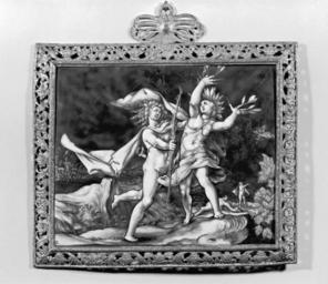 | Keywords: Jacques Laudin I - Plaque with Apollo and Daphne - Walters 44280.jpg The story of Daphne is told by the Roman poet Ovid 43 BC-AD 17 in The Metamorphoses Cupid god of love shot the god Apollo with a gold-tipped arrow kindling his love for the nymph Daphne but Cupid shot her with one tipped with lead stifling love Pursued by Apollo Daphne prayed to her father a river god to save her and she was transformed into a laurel tree Ovid's tales were popular for their eroticism In addition the idea of metamorphosis a fundamental divinely sanctioned change of state offered a way of thinking about the creative act as in the transformation of a chunk of copper ore into a bronze statuette Jacques Laudin who monogrammed this plaque adapted the composition from an engraving of 1589 after a drawing by the Dutch artist Hendrick Goltzius The frame is original ca 1650 Baroque painted enamel and gilded copper gilded brass frame cm 16 20 6 accession number 44 280 760 Ralph Bernal date and mode of acquisition unknown Sale London March 5 1855 lot 1530 T Russell Kent date and mode of acquisition unknown Sale London November 24 1908 lot 71 George Robinson Harding London date and mode of acquisition unknown Henry Walters Baltimore May 21 1912 by purchase Walters Art Museum Henry Walters Acquired by Henry Walters 1912 place of origin Limoges France Walters Art Museum license Limoges enamel - 17th century Jacques Laudin I Baroque paintings in the Walters Art Museum Media contributed by the Walters Art Museum needs category review Media contributed by the Walters Art Museum needs artist review Painted enamel art in the Walters Art Museum Apollo and Daphne |