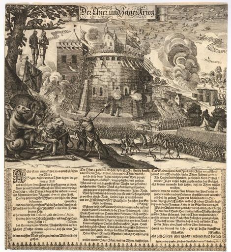 | Keywords: Jaegerkrieg.jpg Der Thier und Jäger Krieg A broadside satirising ordinary people and their aspiration to gain political power by showing the world upside-down with animals storming the fortification of the hunters; with an etching showing a castle attacked by various groups of animals and birds defended by hunters in the left foreground two hunters hanged in a tree underneath is a lion discussing with a bear an elephant a deer a fox and a hare; with engraved title and lettering A-M and with letterpress text in three columns the letterpress with a three-sided border of type ornaments Nuremberg Fürst 1652 http //www britishmuseum org/research/search_the_collection_database/search_object_details aspx objectid 1468994 partid 1 1652 PD-old-100 Hares hunting the hunter |