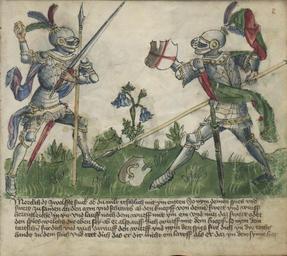 | Keywords: Jagiellonian Ms.Germ.Quart.16 (Gladiatoria) 07r - Longsword in armor.jpg Artwork en Longsword a leaf from the Gladiatoria fechtbuch Ms Germ Quart 16 folio 7r pl Półtorak karta z Gladiatoria fechtbuch Ms Germ Quart 16 folio 7r ink color parchment Kraków Institution Jagiellonian Library Caption Merckch daz zwolffte stuck ob du wilt reschlich mit ym entten So nym deinen spies vnd swert zu sammen an den arm vnd schrawb ab den knopff von deinem swert vnd würff hertigleichen in yn vnd lauff nach dem wurff mit ym ein vnd nütz daz swert oder den spies welchs dir eben sey ab er also auff dich würff mit dem knopf so nym dein tartschen für dich vnd vach darauff den wurff vnd nym den spies für dich yn dye recht handt zu dem stich vnd rett dich das er dir nicht einlawff als er daz yn dem synne hat en Note the twelfth play If you want to end him rightly hold your spear and sword together on your arm unscrew the pommel of your sword and throw it at him vigorously Close in with the throw and use your sword or spear whatever suits you best When he throws his pommel at you keep your buckler close to you and watch out for the throw Hold your spear in your right hand and prepare to thrust to stop him from closing in if it is his intention http //wiktenauer com/wiki/Gladiatoria_ MS_Germ Quart 16 Wiktenauer Ms Germ Quart 16 NR 5878 1989 ROK ca 1435 Unknown Germany Copyright expired PD-Art Other versions PD-old-70-1923 Ms Germ Quart 16 Swords of the 15th century Medieval knights Medieval miniatures of armour People with shields in art People with swords in art People with spears in art 1430s |