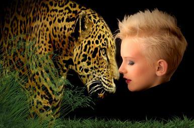 Keywords: jaguar woman affection grass romance romantic together happy togetherness feelings