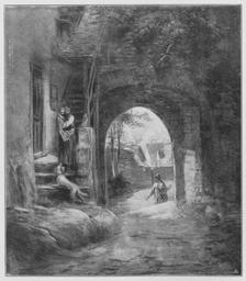 Keywords: Jahrhundertausstellung 1906 KatNr. 0337.jpg Artwork Creator Jakob Fürchtegott Dielmann Torweg Oil Canvas cm 20 18 Victor Mössinger Frankfurt a M lt Quelle self scanned from own book Vorstand der Deutschen Jahrhundertausstellung Herausgeber žKatalog zur Ausstellung deutscher Kunst aus der Zeit von 1775 “1875 in der Königlichen Nationalgalerie Berlin Verlag F Bruckmann AG München 1906 2 Bände PD-old-70-1923 Other versions Jakob Fürchtegott Dielmann Jahrhundertausstellung deutscher Kunst 1906 ImageNote 1 15 22 1262 1424 1282 1468 2 Hellbrauner Gesamtton mit grauen Begleittönen und blondem Licht Rötliche und blaue Einzelheiten dunkles Grün Durch das Tor Blick auf mattes bräunliches Hellgrün und rosa Dächer “ Bez unten rechts J F Dielmann ImageNoteEnd 1