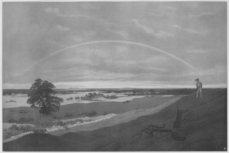 | Keywords: Jahrhundertausstellung 1906 KatNr. 0533.jpg Artwork Creator Caspar David Friedrich Landschaft auf Rügen mit Regenbogen Oil Canvas cm 59 87 Großherzogliches Museum Weimar lt Quelle self scanned from own book Vorstand der Deutschen Jahrhundertausstellung Herausgeber žKatalog zur Ausstellung deutscher Kunst aus der Zeit von 1775 “1875 in der Königlichen Nationalgalerie Berlin Verlag F Bruckmann AG München 1906 2 Bände um 1814 PD-old-70-1923 Other versions Caspar David Friedrich in Jahrhundertausstellung deutscher Kunst 1906 Jahrhundertausstellung deutscher Kunst 1906 ImageNote 1 22 13 2477 1658 2518 1683 2 Kombination von Grün und Blau Das Grün ist im Vordergrund fast durch den braunen Schatten verdeckt Im Mittelplan verschwindet es in der großen Schattensilhouette von bläulichem Grau und erhellt sich jenseits mit gelben Tönen Das Meer dunkelblau mit parallelen weißen Spritzern Im Himmel wird das Hellblau fast ganz von grauen in der Ferne weißen Wolken verdeckt Im Regenbogen überwiegt Blau neben Rosa und Gelb Der Mann im Vordergrund ist in helles Grau gekleidet mit roten blauen und hellbraunen Einzelheiten “ Um 1814 ImageNoteEnd 1 |
