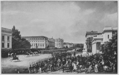 | Keywords: Jahrhundertausstellung 1906 KatNr. 0928.jpg Artwork Creator Franz Krüger Parade auf dem Opernplatze Kaiser Nikolaus I führt sein Garde-Kavallerie-Regiment König Friedrich Wilhelm III vor Oil Canvas cm 245 375 Kaiserl Winterpalais St Petersburg lt Quelle self scanned from own book Vorstand der Deutschen Jahrhundertausstellung Herausgeber žKatalog zur Ausstellung deutscher Kunst aus der Zeit von 1775 “1875 in der Königlichen Nationalgalerie Berlin Verlag F Bruckmann AG München 1906 2 Bände 1829 PD-old-70-1923 Other versions Parade on Opernplatz in 1822 by Franz Krüger Friedrich Wilhelm III of Prussia Nicholas I of Russia in documentary paintings Jahrhundertausstellung deutscher Kunst 1906 ImageNote 1 7 9 1783 1126 1806 1146 2 Die Gebäude in grauem Gelb die Bäume in mattem Grün Die Straße rötlichgelb mit grauen Steinen In der Vordergrundszene neben der Wache entscheidet das leuchtende Braunrot einiger Pferde das Grau des Anzugs des ganz vorn stehenden Theaterfriseurs mit der gelben Weste endlich das Purpur des Reitknechts der das Pferd zu bändigen sucht “ 1829 ImageNoteEnd 1 |