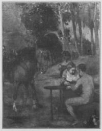 | Keywords: Jahrhundertausstellung 1906 KatNr. 1119.jpg Artwork Creator Hans von Marées Gruppe mit Pferd Oil Canvas auf Pappe cm 63 51 Professor Adolf von Hildebrand Florenz-München lt Quelle Vorstand der Deutschen Jahrhundertausstellung Herausgeber žKatalog zur Ausstellung deutscher Kunst aus der Zeit von 1775 “1875 in der Königlichen Nationalgalerie Berlin Verlag F Bruckmann AG München 1906 2 Bände ; self scanned from own book 1869 PD-old-70-1923 Other versions Paintings by Hans von Marées Jahrhundertausstellung deutscher Kunst 1906 Hans von Marées in Jahrhundertausstellung deutscher Kunst 1906 ImageNote 1 15 12 774 1003 807 1032 2 Der bestimmende Ton ist das milde rötliche Braun des Pferdes des Tisches und der Menschen der sich auch im Boden und verdünnt zwischen den Bäumen wiederholt Außerdem in der Landschaft Gemenge von grünen und blauen Tönen “ 1869 Rom ImageNoteEnd 1 |