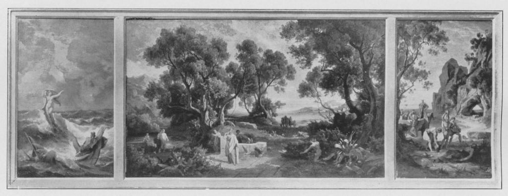 | Keywords: Jahrhundertausstellung 1906 KatNr. 1346.jpg Artwork Creator Friedrich Preller der Ältere Farbenskizzen zur Odyssee Oil Canvas mittlere cm 40 67 seitliche cm 40 24 Frau von Eichel-Streiber Eisenach lt Quelle Vorstand der Deutschen Jahrhundertausstellung Herausgeber žKatalog zur Ausstellung deutscher Kunst aus der Zeit von 1775 “1875 in der Königlichen Nationalgalerie Berlin Verlag F Bruckmann AG München 1906 2 Bände ; self scanned from own book 1864/65 PD-old-70-1923 Other versions Friedrich Preller der Ältere Jahrhundertausstellung deutscher Kunst 1906 ImageNote 1 25 30 1951 711 1998 771 2 Das Fleisch in mehr oder weniger gebräuntem Rosa Die Kostüme vorwiegend rosa zuweilen mattgelb und mattblau Die Felsen oft im selben Rosa auch in grauen und graubraunen Tönen Ebenso die Architektur Die Bäume grünlichgrau und braungrün Das Wasser türkisblau oder grünlichblau Der Himmel fast ausnahmslos türkisblau mit weißgrauen und rosabraunen Wolken “ Die Bezeichnung gewöhnlich unten links Monogramm F P zwischen 18 und 65 die Nrn 1345 “47 und 1350 datiert 1864 ImageNoteEnd 1 |