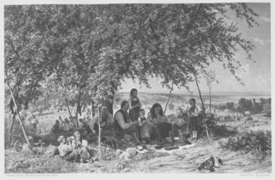 | Keywords: Jahrhundertausstellung 1906 KatNr. 1610.jpg Theodor Christoph Schüz Mittagsruhe bei der Ernte Technique Oil Canvas cm 108 5 172 5 Kgl Staatsgemäldegalerie Stuttgart lt Quelle Vorstand der Deutschen Jahrhundertausstellung Herausgeber žKatalog zur Ausstellung deutscher Kunst aus der Zeit von 1775 “1875 in der Königlichen Nationalgalerie Berlin Verlag F Bruckmann AG München 1906 2 Bände ; self scanned from own book 1862 PD-old-70-1923 Other versions Theodor Schüz Jahrhundertausstellung deutscher Kunst 1906 ImageNote 1 33 39 2554 1653 2613 1709 2 Entscheidend der blaue bezw lila Ton der Kleider der sich in dem bläulichen Grün des Panoramas in zarten Tönen wiederholt; das vom Gelbrot der Äpfel unterbrochene Gelbgrün des Baumes; endlich die verschiedenen Töne des Gelbs das von Strohgelb ausgehend sich mit rosa und hellbraunen Tönen vereint Im Vordergrund viele rote Details Hellblauer Himmel mit weißgrauen Wolken “ Bez am Markstein in der Mitte Monogramm T S 1862 ImageNoteEnd 1 |