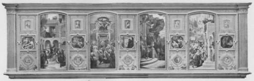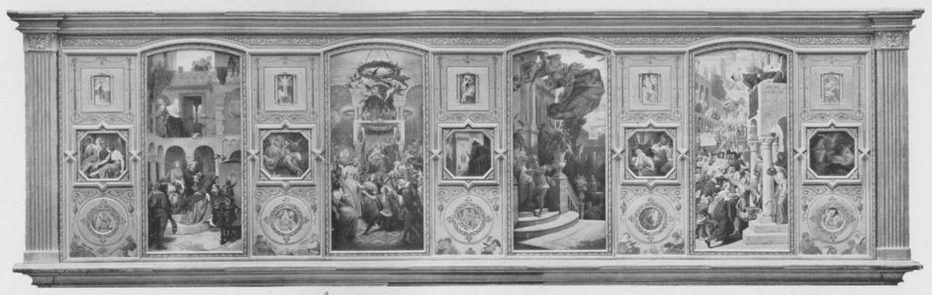 | Keywords: Jahrhundertausstellung 1906 KatNr. 1623.jpg Artwork Creator Moritz von Schwind Aschenbrödel Oil Canvas cm 121 432 Freiherr von und zu Frankenstein Schloß Ullstein Bayern lt Quelle Vorstand der Deutschen Jahrhundertausstellung Herausgeber žKatalog zur Ausstellung deutscher Kunst aus der Zeit von 1775 “1875 in der Königlichen Nationalgalerie Berlin Verlag F Bruckmann AG München 1906 2 Bände ; self scanned from own book 1852 “1854 PD-old-70-1923 Other versions Moritz von Schwind Jahrhundertausstellung deutscher Kunst 1906 ImageNote 1 14 21 2808 864 2844 903 2 Zyklus in einem Rahmen Die vier großen Panneaux auf Leinwand die fünf achteckigen auf Holz ausgenommen das letzte rechts und das vorletzte links Alles übrige Holz In der Pantoffelprobe überwiegen rosa rote weißgraue und gelbe Töne Aschenbrödel in taubengrauem Gewand Darauf folgt die bläuliche Nachtszene deren Ton sich in zwei der achteckigen Bildchen wiederholt In der Szene wo der Prinz vor Aschenbrödel kniet überwiegen wieder rötliche Töne Die Kronleuchter werfen braunrotes Licht Das erste Bild mit den zu Balle gehenden Schwestern wird von der grauen und havanabraunen Architektur der grünen Sänfte mit dem braunen Maultier und den orangebraunen und rötlichbraunen Gewändern der Schwestern beherrscht Dieselben Farben in dem ersten Achteck links daneben Die Rundbildchen sind Grisaille Die Ornamentik zeigt namentlich Grün Blau und Rot auf hellbraunem Grund Die kleinen Hochbilder in denen die helle Fleischfarbe entscheidet sind mit rosa Säulen gerahmt die sich auf goldenen weiß ornamentierten rechteckigen Panneaux befinden “ 1852 “54 ImageNoteEnd 1 |