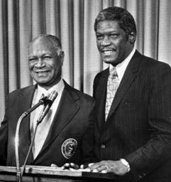 | Keywords: florida state library and archives of florida statelibraryandarchivesofflorida college football collegefootball florida agricultural and mechanical university floridaagriculturalandmechanicaluniversity famu florida a&m rattlers (football team) floridaamrattlersfootballteam jake gaither jakegaither big jim williams bigjimwilliams coaches athletic directors athleticdirectors great floridians greatfloridians press conferences pressconferences african american men africanamericanmen black history month blackhistorymonth blackandwhite people monochrome black and white Local call number: PR12670 Title: Jake Gaither with "Big Jim" Williams: Tallahassee, Florida Date: February 22, 1972 General note: Athletic director Jake Gaither (left) appearing at the naming of "Big Jim" Williams as the new head football coach at Floria Agricultural and Mechanical University. Physical descrip: 1 photonegative - b&w - 3 x 5 in. Series Title: Print collections Repository: State Library and Archives of Florida, 500 S. Bronough St., Tallahassee, FL 32399-0250 USA. Contact: 850.245.6700. Archives@dos.state.fl.us Persistent URL: www.floridamemory.com/items/show/11076 Visit Florida Memory to learn more about the history of college football in Florida. Visit Florida Memory to find resources for Black History Month and to learn about the contributions of African-Americans in Florida history. Local call number: PR12670 Title: Jake Gaither with "Big Jim" Williams: Tallahassee, Florida Date: February 22, 1972 General note: Athletic director Jake Gaither (left) appearing at the naming of "Big Jim" Williams as the new head football coach at Floria Agricultural and Mechanical University. Physical descrip: 1 photonegative - b&w - 3 x 5 in. Series Title: Print collections Repository: State Library and Archives of Florida, 500 S. Bronough St., Tallahassee, FL 32399-0250 USA. Contact: 850.245.6700. Archives@dos.state.fl.us Persistent URL: www.floridamemory.com/items/show/11076 Visit Florida Memory to learn more about the history of college football in Florida. Visit Florida Memory to find resources for Black History Month and to learn about the contributions of African-Americans in Florida history. |