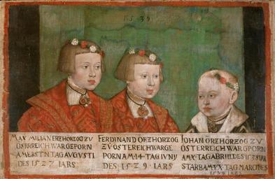 | Keywords: Jakob Seisenegger 007.jpg Painting Creator Jakob Seisenegger de Kaiser Maximilian II 1527-1576 mit seinen Brüdern Ferdinand II 1529-1595 und Johann 1538-1539 de Leinwand 1539 de 40 x 60 cm Rahmenmaße 49 x 68 5 x 6 cm Institution Kunsthistorisches Museum de Beschriftung Beschriftungen auf einem Streifenam unteren Bildrand links MAXIMILIAN ERZHERÖG ZV ÖSTERREICH WAR GEPORN AM ERSTN TAG AVGVSTI DES 1527 JARS; Mitte FERDINAND ÖRZHÖRZOG ZV ÖSTERREICH WAR GEPORN AM 14 TAG IVNY DES 1529 IARS; rechts IOHAN ÖRZHÖRZOG ZV ÖSTERREICH WAR GPORN AM X TAG ABRILL DES 1538 IAR STARB AM XX TAG MARCI DES 1539 IARS<br/> Inv -Nr GG_8191<br/> Provenienz Ambraser Slg <br/> Abgebildete Personen Erzherzog Ferdinand II Sohn des Ferdinand I von Habsburg Österreich Landesherr von Tirol Erzherzog Johann Sohn des Ferdinand I von Habsburg Kaiser Maximilian II Sohn des Ferdinand I von Habsburg Österreich http //bilddatenbank khm at/viewArtefact id 2325 other versions PD-old-100 DEFAULTSORT 1539; Archdukes of Austria Paintings by Jakob Seisenegger in the Kunsthistorisches Museum Ferdinand II Archduke of Austria Maximilian II Holy Roman Emperor Archduke John of Austria 1539 portrait paintings Male 16th-century family portraits of royalty 16th-century portraits of children at bust length Family portraits of Holy Roman Empire rulers Group portraits with 3 persons Portrait paintings of boys Portraits of brothers Pageboy haircut |