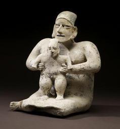 | Keywords: Jalisco - Mother and Child - Walters 20092015 - Three Quarter Right.jpg A mother proudly supports her male child who with her help stands securely on her lap She sits in the proper position for women legs folded to the side and concealed below her wrap skirt This cream-slipped sculpture was made during the culmination of the shaft tomb tradition in West Mexico when tombs were filled with spirited figural sculptures and decorated pottery vessels and the bodies of the deceased were dressed in fine clothing and jewelry of shell and stone The figures' cream-slipped surface and the restrained painting with which her dress is depicted are characteristic of an artistic substyle of the famous El Arenal Brown sculptural tradition of northern Jalisco Jalisco's pottery sculptors created a vast array of figures portraying all manner of social and political personages The figures are famous for the renderings of warriors brandishing shields and club-weapons and wearing helmets and armor of cotton batting Others portray members of the ruling elite majestically standing with staff of office in hand Shamans and healing rites were frequently depicted as were individuals afflicted with diseases or congenital deformities Portrayals of women were equally prominent the majority featuring either their political or spiritual shamanic powers or their magical ability to create life in the form of children This sculpture is a particularly informal yet stately expression of the procreative power of women and their lifelong calling as nurturers 100 BC-AD 200 earthenware white slip with black and red paint cm 37 2 30 9 23 2 accession number 2009 20 15 80170 Michael Robins date and mode of acquisition unknown John G Bourne 1990s mode of acquisition unknown Walters Art Museum Gift of John Bourne 2009 place of origin Jalisco Mexico Walters Art Museum license Pottery from ancient Jalisco in the Walters Art Museum Art of Mexico Media contributed by the Walters Art Museum needs category review Statues of mothers with one child |