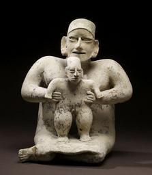 | Keywords: Jalisco - Mother and Child - Walters 20092015.jpg A mother proudly supports her male child who with her help stands securely on her lap She sits in the proper position for women legs folded to the side and concealed below her wrap skirt This cream-slipped sculpture was made during the culmination of the shaft tomb tradition in West Mexico when tombs were filled with spirited figural sculptures and decorated pottery vessels and the bodies of the deceased were dressed in fine clothing and jewelry of shell and stone The figures' cream-slipped surface and the restrained painting with which her dress is depicted are characteristic of an artistic substyle of the famous El Arenal Brown sculptural tradition of northern Jalisco Jalisco's pottery sculptors created a vast array of figures portraying all manner of social and political personages The figures are famous for the renderings of warriors brandishing shields and club-weapons and wearing helmets and armor of cotton batting Others portray members of the ruling elite majestically standing with staff of office in hand Shamans and healing rites were frequently depicted as were individuals afflicted with diseases or congenital deformities Portrayals of women were equally prominent the majority featuring either their political or spiritual shamanic powers or their magical ability to create life in the form of children This sculpture is a particularly informal yet stately expression of the procreative power of women and their lifelong calling as nurturers 100 BC-AD 200 earthenware white slip with black and red paint cm 37 2 30 9 23 2 accession number 2009 20 15 80170 Michael Robins date and mode of acquisition unknown John G Bourne 1990s mode of acquisition unknown Walters Art Museum Gift of John Bourne 2009 place of origin Jalisco Mexico Walters Art Museum license Pottery from ancient Jalisco in the Walters Art Museum Art of Mexico Media contributed by the Walters Art Museum needs category review Statues of mothers with one child |