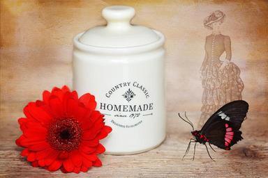 Keywords: jam container jam jar container flower gerbera blossom bloom red butterfly vintage close