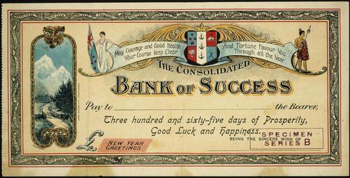 | Keywords: text photo border A novelty cheque "issued" by the "Consolidated Bank of Success" and issued to the value of "three hundred and sixty-five days of Prosperity, good luck and happiness". Stamp in the lower right corner identifies this as Specimen series B. At the left there is a inset New Zealand scene of a bridge and road to a mountain, topped with a Maori tiki motif. At the top, Zealandia with the New Zealand flag, and a Maori warrior with a long spear, both flank the New Zealand coat of arms. There is a border of good luck slogans. Quantity: 1 colour art print(s). Physical Description: Coloured lithograph, with perforated left edge, 120 x 233 mm. Provenance: Transferred from Manuscripts (MS-Papers-7445-03) in 2002. May be part of the A F McDonnell papers at MS-Papers-0151. Transfers: FMSA. James Rodger & Co (Firm) :The Consolidated Bank of Success. May courage and good health your course keep clear, and fortune favour you through all the year. [Draft novelty Christmas and New Year gift cheque / printed by] James Rodger & Co. Christchurch. 191[4].. James Rodger & Co (Firm) :[Two draft novelty Christmas and New Year gift cheques / printed by] James Rodger & Co. Christchurch. 191[4].. Ref: Eph-A-CARDS-New-Year-1914-02. Alexander Turnbull Library, Wellington, New Zealand. natlib.govt.nz/records/22851347 A novelty cheque "issued" by the "Consolidated Bank of Success" and issued to the value of "three hundred and sixty-five days of Prosperity, good luck and happiness". Stamp in the lower right corner identifies this as Specimen series B. At the left there is a inset New Zealand scene of a bridge and road to a mountain, topped with a Maori tiki motif. At the top, Zealandia with the New Zealand flag, and a Maori warrior with a long spear, both flank the New Zealand coat of arms. There is a border of good luck slogans. Quantity: 1 colour art print(s). Physical Description: Coloured lithograph, with perforated left edge, 120 x 233 mm. Provenance: Transferred from Manuscripts (MS-Papers-7445-03) in 2002. May be part of the A F McDonnell papers at MS-Papers-0151. Transfers: FMSA. James Rodger & Co (Firm) :The Consolidated Bank of Success. May courage and good health your course keep clear, and fortune favour you through all the year. [Draft novelty Christmas and New Year gift cheque / printed by] James Rodger & Co. Christchurch. 191[4].. James Rodger & Co (Firm) :[Two draft novelty Christmas and New Year gift cheques / printed by] James Rodger & Co. Christchurch. 191[4].. Ref: Eph-A-CARDS-New-Year-1914-02. Alexander Turnbull Library, Wellington, New Zealand. natlib.govt.nz/records/22851347 |